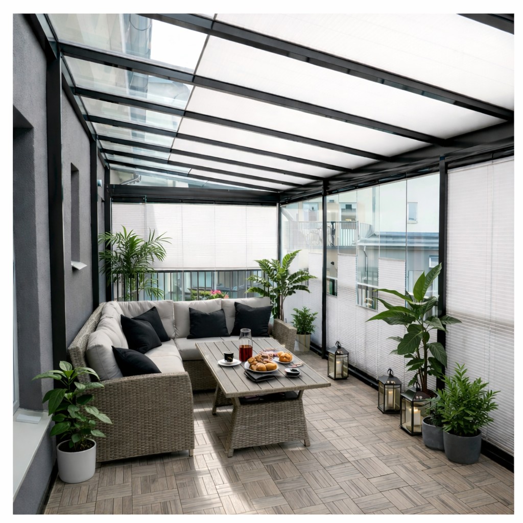 - Tvättbar Öko-Tex-certifierad polyesterduk. Målade aluminiumprofiler.